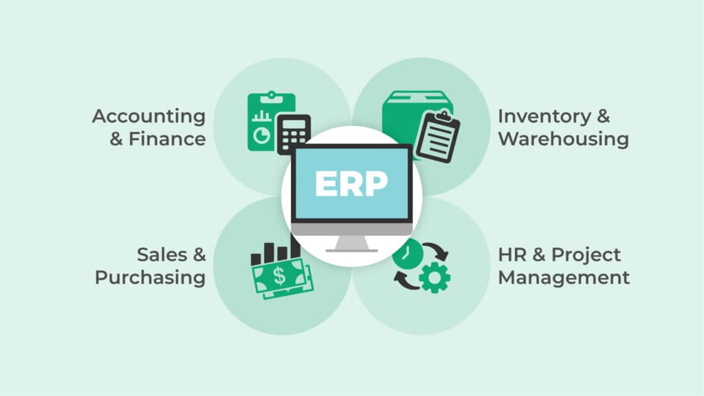 Enterprise resource planning spans finance, inventory, sales, purchasing, and HR.
